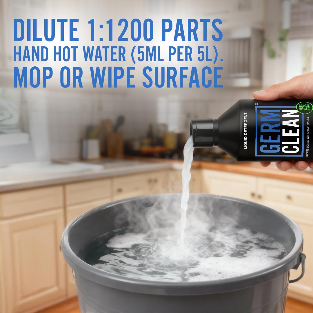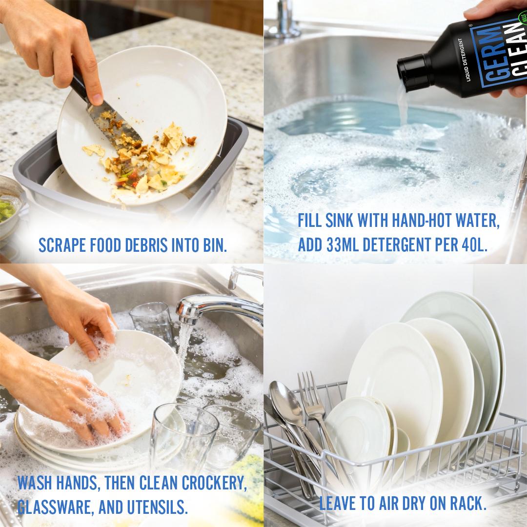 CROCKERY, GLASSWARE & KITCHEN UTENSILS: Dilute 1:1200 parts hand hot water (33 ml per 40L) in a sink. Scrape off food debris into bin. Wash items thoroughly. Rinse in clean hot water. Allow to air dry. GENERAL CLEANING: Dilute 1:1200 parts hand hot water (5 ml per 5L). Mop or wipe surface.